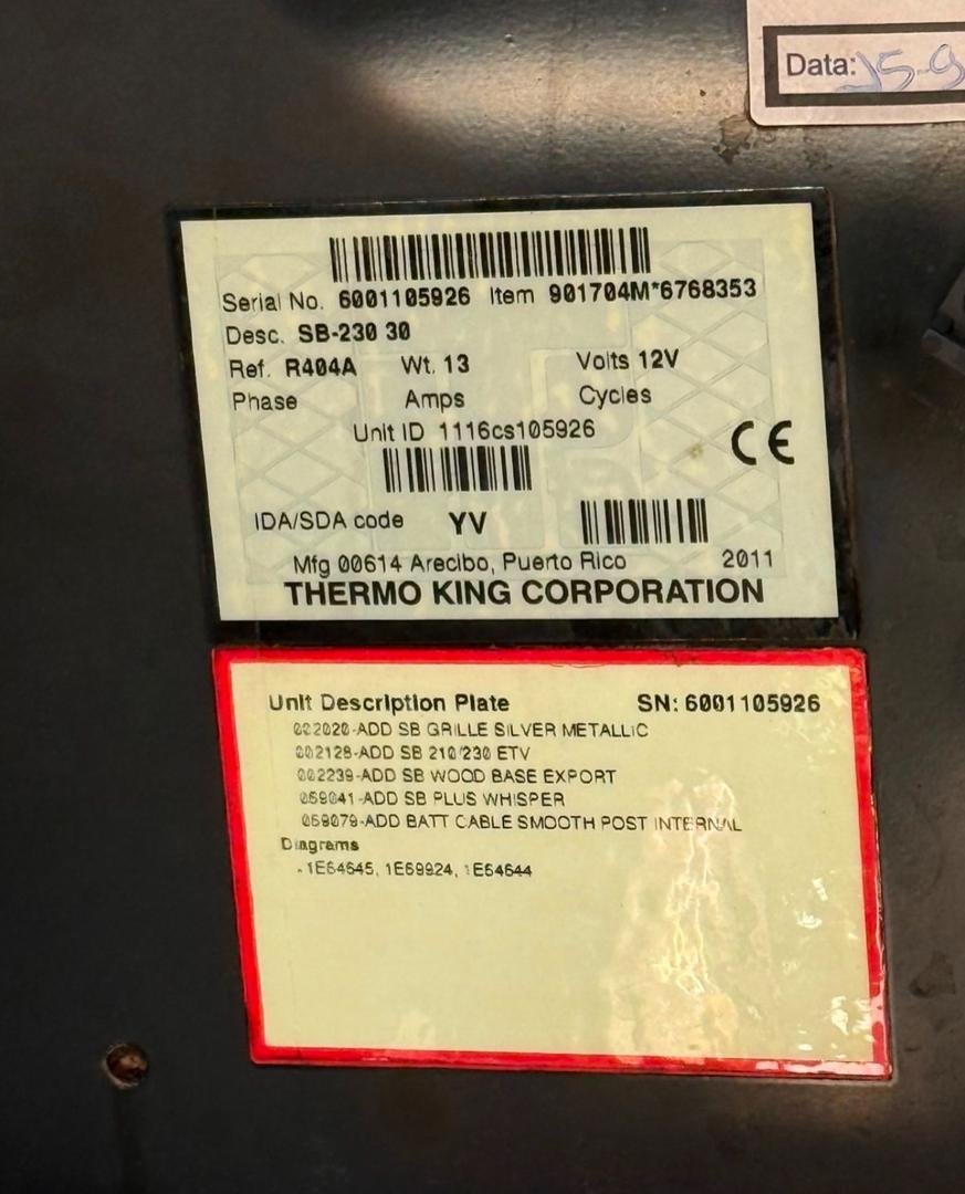 • Refrigerant: R-404A (standard), with a charge of approximately 11.5 pounds, though some sources suggest overcharging issues (e.g., 20 pounds) can occur if leaks are not addressed.Thermoking SB-230 Unit For Sale Near Me